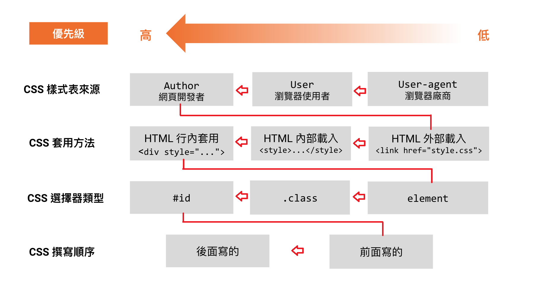 - 讓選擇器的優先級放低:撰寫樣式時,盡量選用 Class 或 Element 的級別的選擇器,非必要不用 id 或複雜的選擇器組合,保留多一點彈性的空間給後續的樣式來覆蓋。