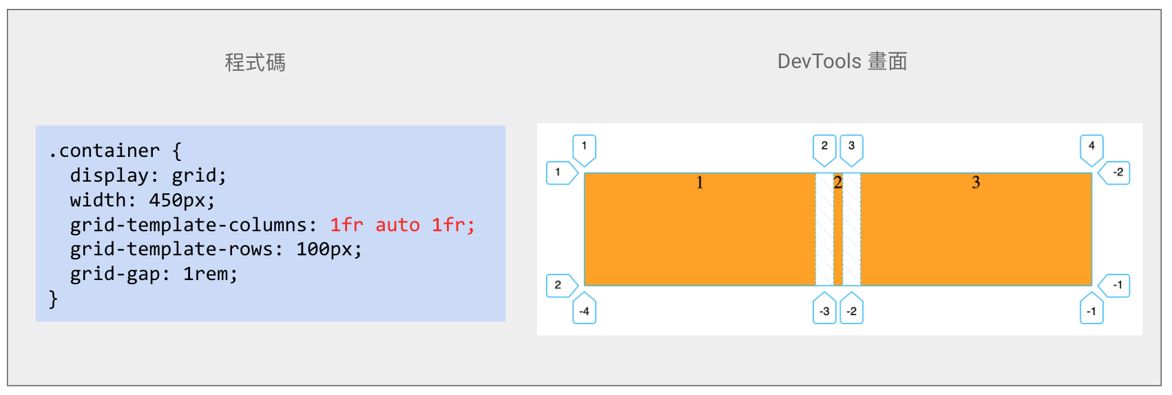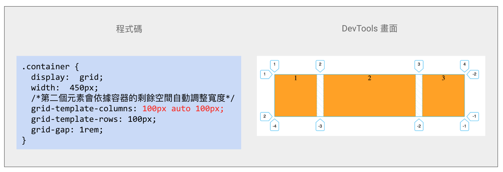 - auto 元素的尺寸簡單來說是:內容多大就有多大,但留意它會依照同一列 / 同一行最大尺寸的格子進行調整,例如未來如果有第二行、第二列,而它的寬度是 100px,那目前這個很窄的2號格子也會被撐寬為 100px。