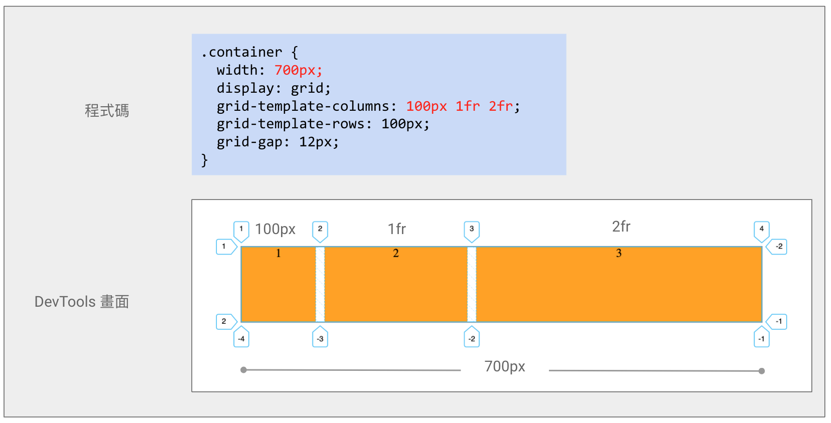 grid-template-columns 和 grid-template-rows 的值除了使用基本的網頁單位 px, em, rem, %, 來設定之外,