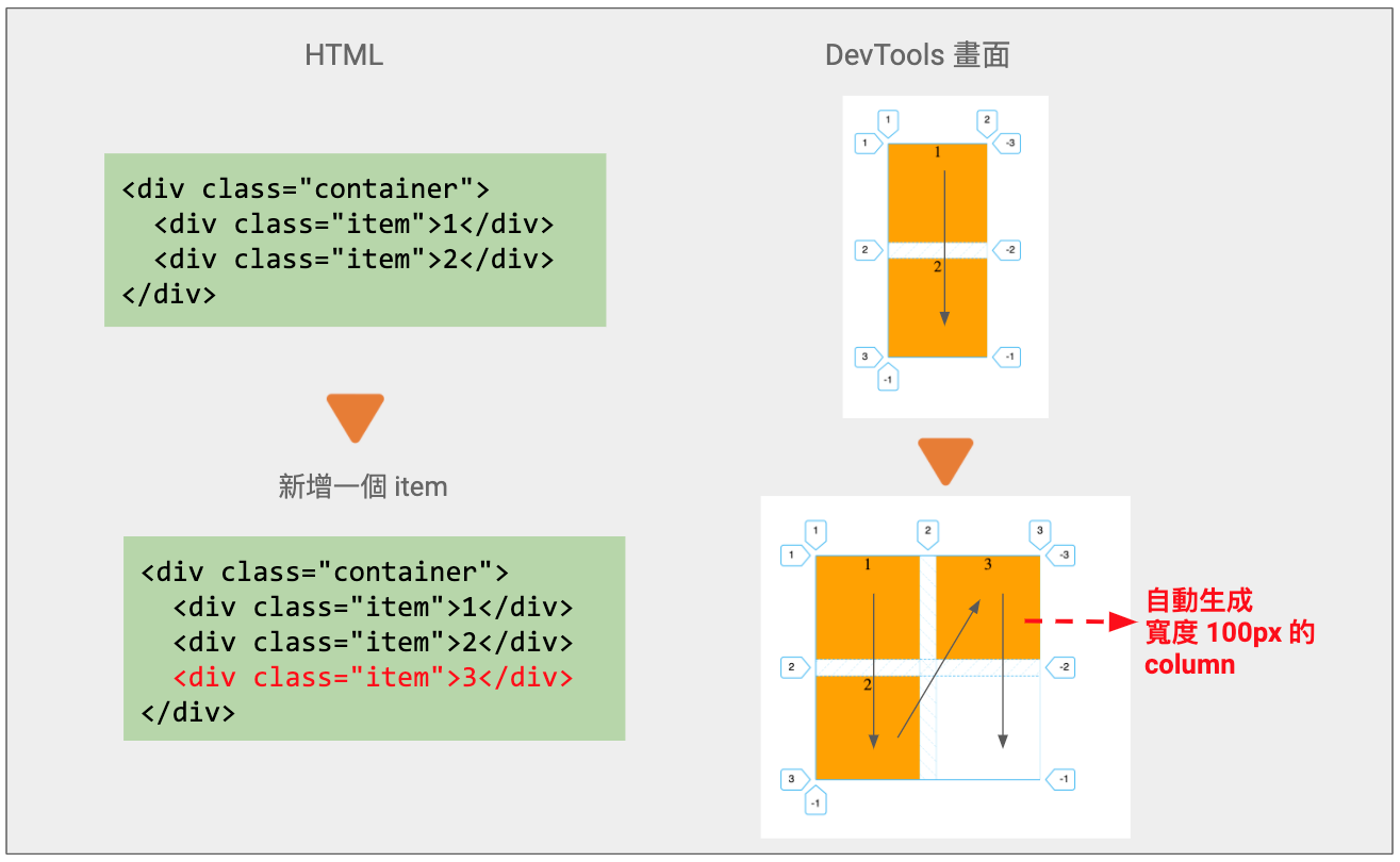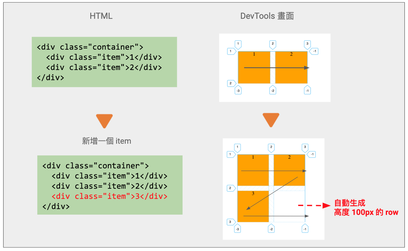 假設第一行有兩列,放滿後會被推向下一行,若是有設定grid-auto-rows高,那麼會自動生成下一行高,並把元素推下一行的第一列。
