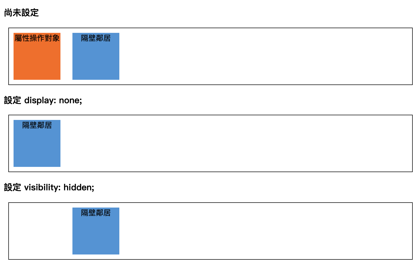 display: none 與 visibility: hidden 都是隱藏元素的方法,差別在於 display: none 會一口氣使操作對象從文字流中拔除,而 visibility: hidden 則像是用一塊白布蓋起來的感覺,畫面上不顯示,但還是會佔一個空間: