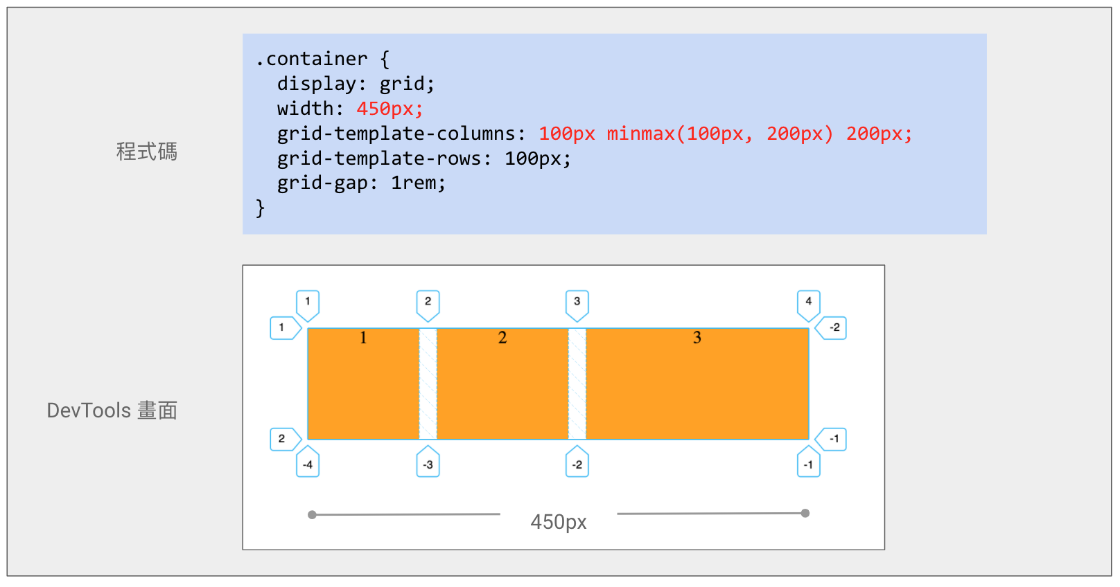 minmax(min, max) 能夠給定尺寸最小和最大值,讓尺寸的決定變得相對彈性。