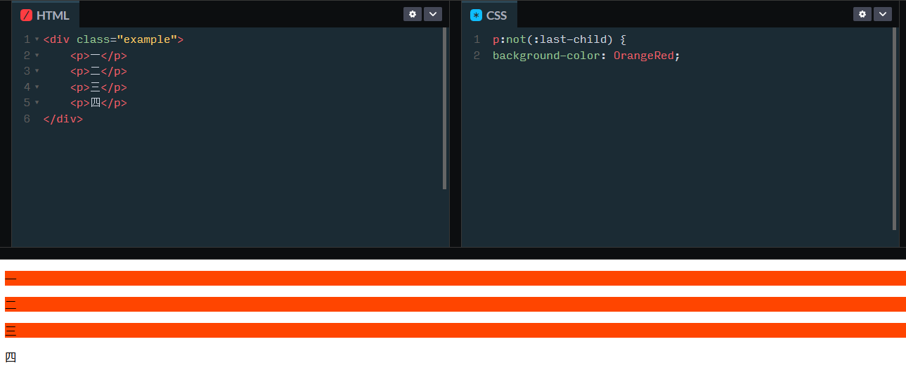 意思則是 所有的p元素橘紅色背景,除了最後一個p元素