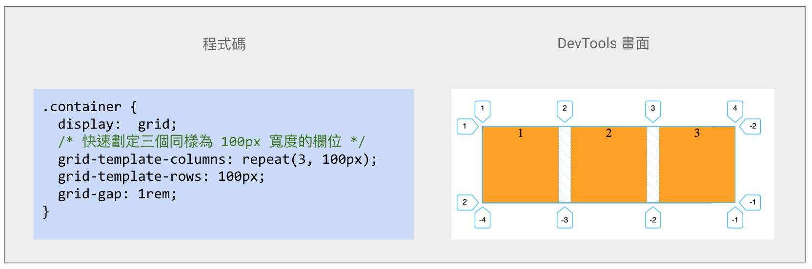 透過 repeat() 的使用可以大量快速的設定重複區塊: