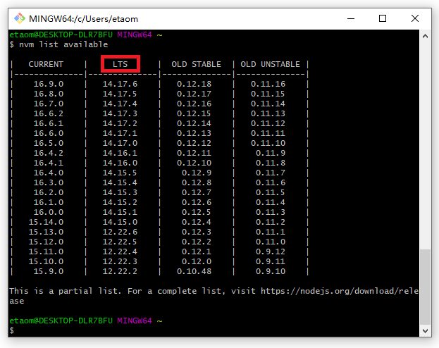 可以先在指令欄內輸入 nvm list available 來查看可以安裝的 Node.js的版本