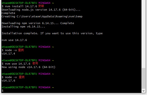 使用17.17.6的Node.js,若未來要切換版本,同樣也可以輸入這個指令
