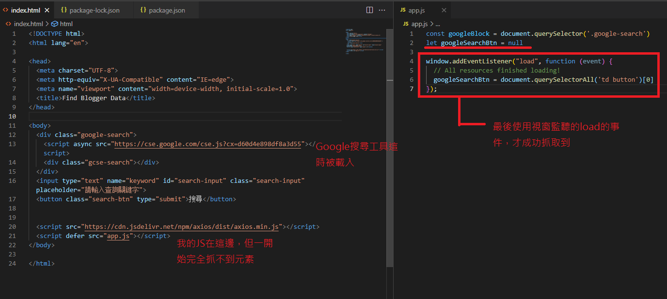 後來我嘗試使用DOMContentLoaded事件,但發現還是無法選到,我想是因為此時google的外部資源尚未讀取完成,所以還抓不到,