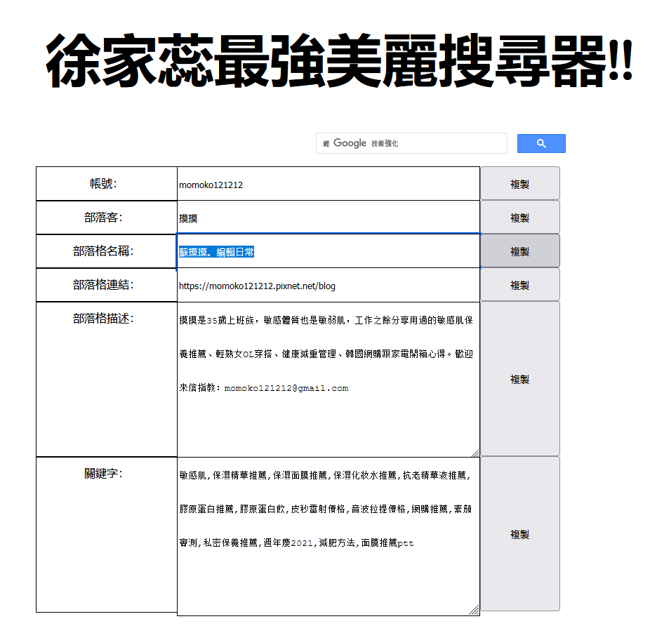 由於朋友工作關係,常常需要蒐集各部落客,部落格的名稱,部落客的網址,和主人的email蒐集起來,並且詳列出來後,它可以輕易地一鍵copy,這樣可以省得它每次都要用各自官方的部落格去搜尋相關資料,然後再將這些資料手動貼上。