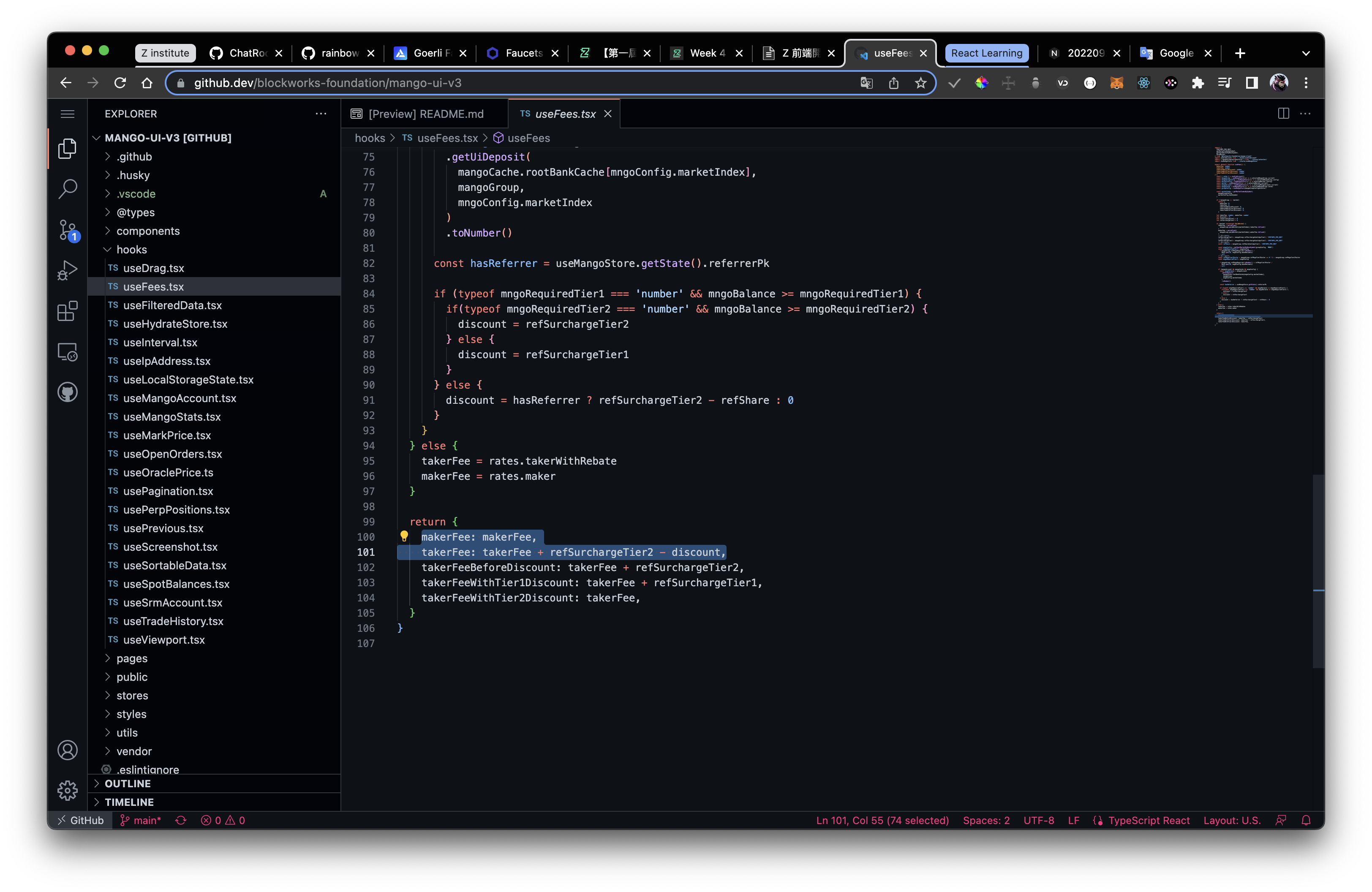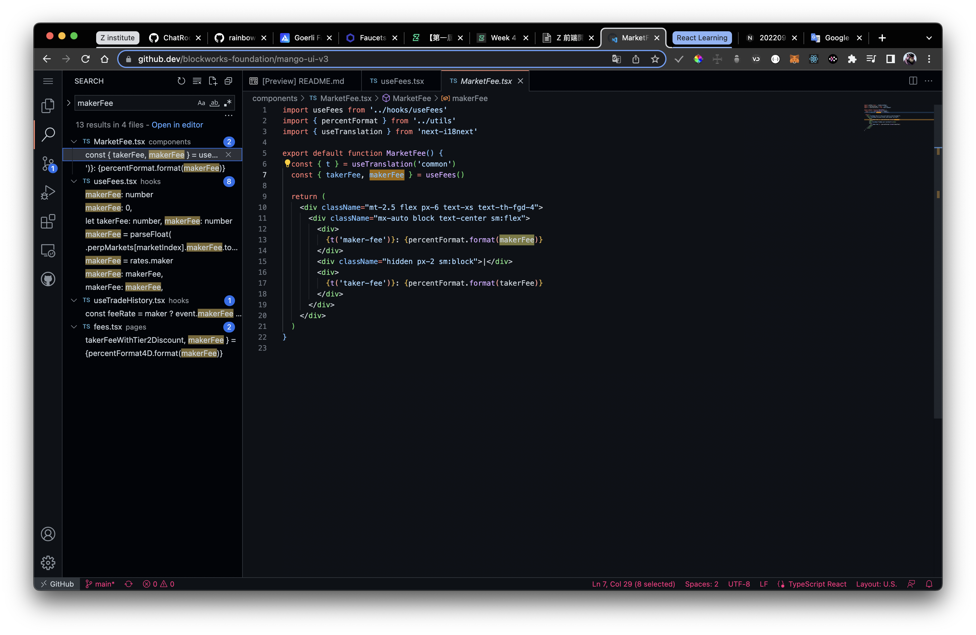 然後透過 command + shift + f 來搜尋 object 的名稱,可以找到在 Component 裡的 MarketFee.tsx 引入了 useFees(),初始化這個 react 的屬性,有點像是每個 hooks 都是一個小的 store,但也更容易去分辨用途。