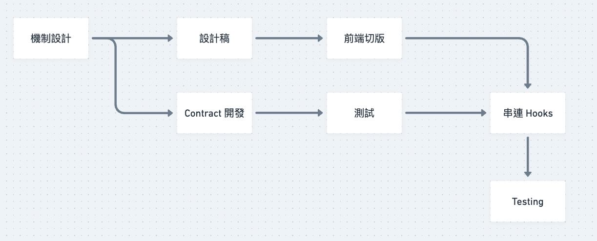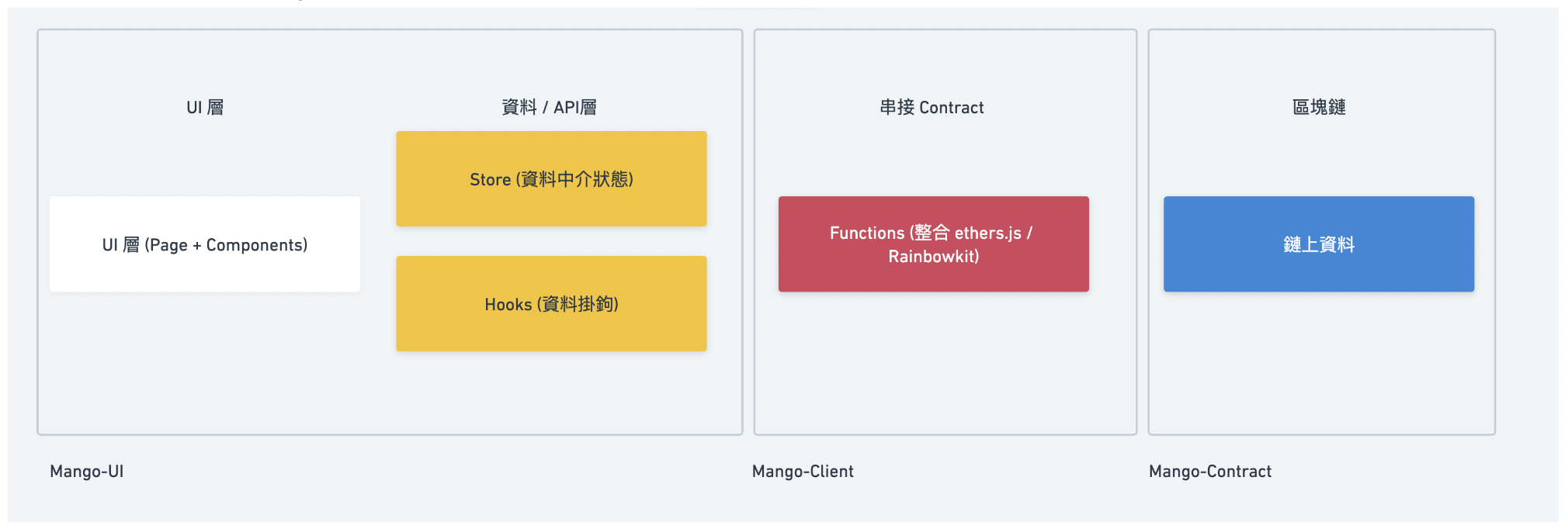 結構分析 1. UI 層只做事覺化呈現 2. 在資料 / API 層,要想到在包裝完後,假設我用 useFees,我就只能取到 fee,而不要去想要怎麼串接 Contract,而這些 API 可能會定時去呼叫 Hooks 然後去更新資料,在回應資料給 UI。 3. 串接 contract 的部分,則是直接去想我在鏈上取得資料玩後的處理跟包裝成 React 的一個 function,再用 Hooks 去做處理。