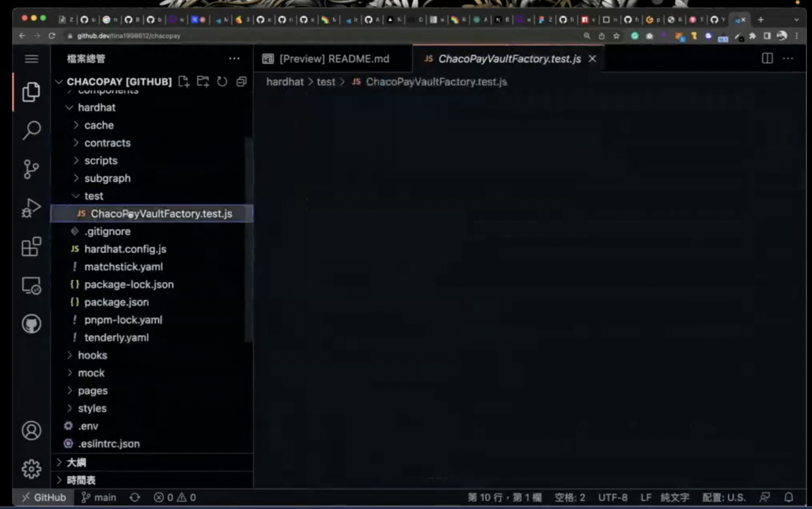 - 在範例中,可以看到 hardhat 資料夾中直接把 contract 放進去,或是裡面一些測試用的 code,都會放在 hardhat 這資料夾內