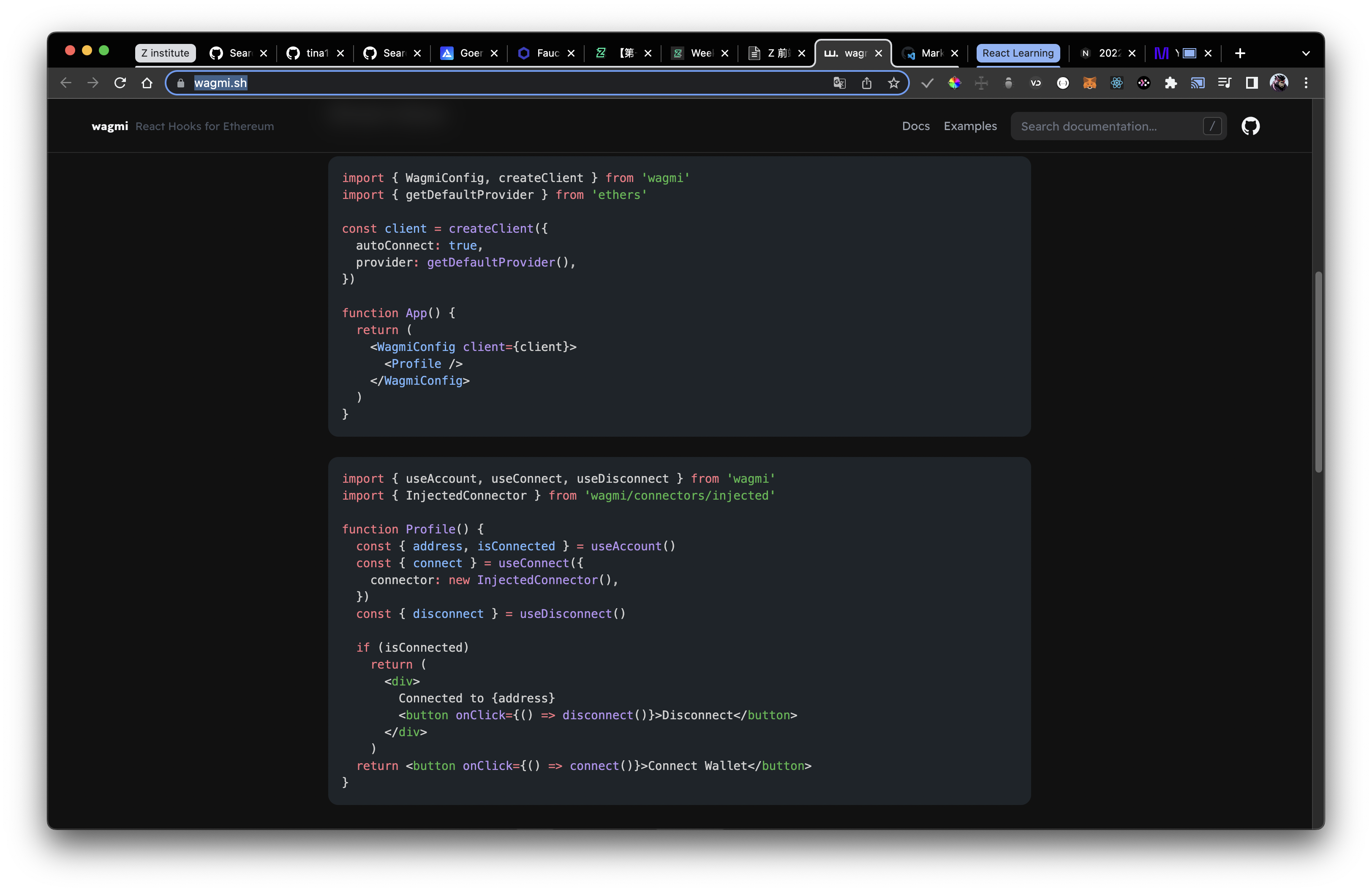 Wagmi 也是一個不錯的 React 相關的 hooks,專們是給 Ethereum 用的,他等於也是給 Ethers 用的一個語法糖,它包括的語法糖就比 RainbowKit 多一些